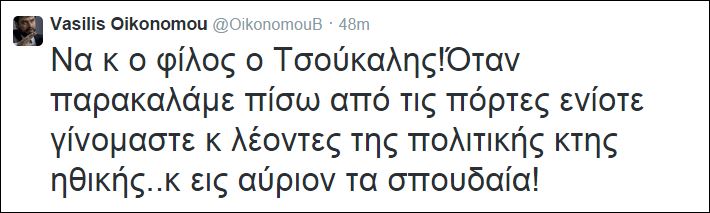 «Να κ ο φίλος ο Τσούκαλης! Όταν παρακαλάμε πίσω από τις πόρτες ενίοτε γινόμαστε κ λέοντες της πολιτικής κ της ηθικής.. κ εις αύριον τα σπουδαία!», έγραψε ο κ. Οικονόμου.