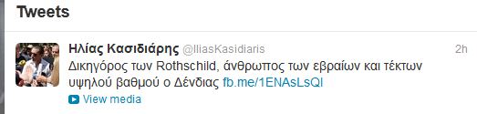 Άστραψε και βρόντηξε ο Ηλίας Κασιδιάρης κατά του Νίκου Δένδια.Ο εκπρόσωπος Τύπου της Χρυσής Αυγής εξαπέλυσε νέα πυρά προς το πρόσωπο του υπουργού Προστασίας του Πολίτη. «Δικηγόρος των Rothschild, άνθρωπος των εβραίων και τέκτων υψηλού βαθμού ο Δένδιας», είπε χαρακτηριστικά ο Κασιδιάρης μιλώντας σε εκπομπή του Σκάϊ.Δείτε το βίντεο που ανέβασε και ο ίδιος στον προσωπικό του λογαριασμό στο Twitter.