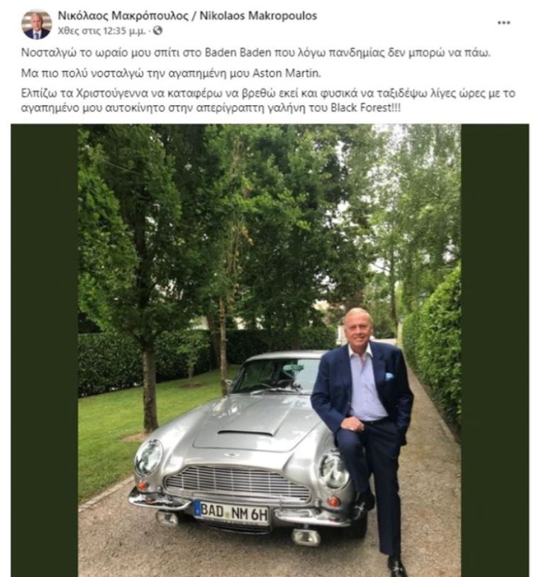 Συγκεκριμένα, σε ανάρτησή του στο Facebook, ανέβασε μια φωτογραφία όπου στέκεται μπροστά από το πολυτελές αυτοκίνητο και γράφει χαρακτηριστικά: “Νοσταλγώ το ωραίο μου σπίτι στο Baden Baden που λόγω πανδημίας δεν μπορώ να πάω. Μα πιο πολύ νοσταλγώ την αγαπημένη μου Aston Martin. Ελπίζω τα Χριστούγεννα να καταφέρω να βρεθώ εκεί και φυσικά να ταξιδέψω λίγες ώρες με το αγαπημένο μου αυτοκίνητο στην απερίγραπτη γαλήνη του Black Forest!!!”. Φαίνεται ότι εν μέσω lockdown εξαιτίας της πανδημίας του κορονοϊού, ο κ. Μακρόπουλος νοστάλγησε τις παλιές, ξέγνοιαστες εποχές, αλλά πυροδότησε σχόλια στα social media.