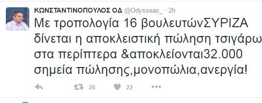Στην τροπολογία αναφέρθηκε και ο βουλευτής της Δημοκρατικής Συμπαράταξης Οδυσσέας Κωνσταντινοπουλος ο οποίος έγραψε στο Twitter: «Με τροπολογία 16 βουλευτών ΣΥΡΙΖΑ δίνεται η αποκλειστική πώληση τσιγάρων στα περίπτερα & αποκλείονται 32.000 σημεία πώλησης, μονοπώλια, ανεργία!»