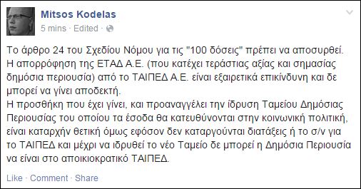 Την απόσυρση του άρθρου 24 από το νομοσχέδιο για τις 100 δόσεις καθώς και την τροποποίηση της διάταξης για την απορρόφηση της ΕΤΑΔ από το ΤΑΙΠΕΔ ζητά ο Δημήτρης Κοδέλας με ανάρτηση στον προσωπικό του λογαριασμό στο Facebook. Ο βουλευτής του ΣΥΡΙΖΑ επισημαίνει πως η διάταξη για τη δημόσια περιουσία είναι «εξαιρετικά επικίνδυνη» και δεν μπορεί να γίνει αποδεκτή και τονίζει ότι αυτή δεν μπορεί να βρίσκεται στο «αποικιοκρατικό ΤΑΙΠΕΔ».