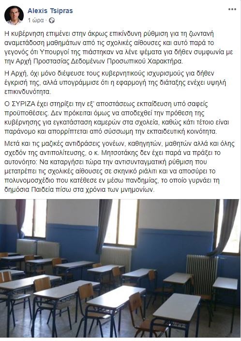 «Η κυβέρνηση επιμένει στην άκρως επικίνδυνη ρύθμιση για τη ζωντανή αναμετάδοση μαθημάτων από τις σχολικές αίθουσες και αυτό παρά το γεγονός ότι υπουργοί της πιάστηκαν να λένε ψέματα για δήθεν συμφωνία με την Αρχή Προστασίας Δεδομένων Προσωπικού Χαρακτήρα», τονίζει ο Αλέξης Τσίπρας με ανάρτηση του στα μέσα κοινωνικής δικτύωσης.