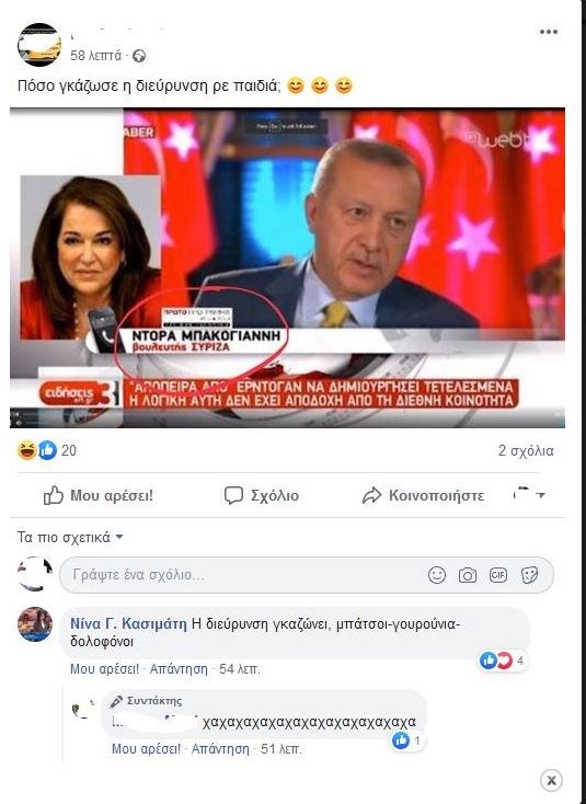 Αντιδράσεις έχει προκαλέσει το σχόλιο της βουλευτή Β΄ Πειραιά του ΣΥΡΙΖΑ, Νίνα Κασιμάτη σε ανάρτηση στο facebook με ένα screenshot από την ΕΡΤ, όπου η Ντόρα Μπακογιάννη αναγραφόταν ως βουλευτής του κόμματος της Αξιωματικής Αντιπολίτευσης.Συγκεκριμένα, η φωτογραφία συνοδευόταν από την ανάρτηση που ανέφερε: «Πόσο γκάζωσε η διεύρυνση ρε παιδιά;» με την Νίνα Κασιμάτη να σχολιάζει: “Η διεύρυνση γκαζώνει, μπάτσοι-γουρούνια-δολοφόνοι”. Δείτε την ανάρτηση και το σχόλιο της βουλευτή: