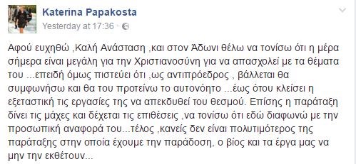 Την αντίδραση της βουλευτή της ΝΔ, Κατερίνας Παπακώστα προκάλεσαν οι δηλώσεις του αντιπροέδρου της ΝΔ, Άδωνι Γεωργιάδη στη Realnews σχετικά με την εξεταστική για την Υγεία. Ο αντιπρόεδρος της ΝΔ σε συνέντευξη του στη Realnews επεσήμανε:«Η εξεταστική επιτροπή για την Υγεία, για να έχει νόημα, πρέπει να έχει καλές προθέσεις. Η συγκεκριμένη δυστυχώς γίνεται μόνο με έναν σκοπό: να σπιλώσει ο ΣΥΡΙΖΑ τους πολιτικούς του αντιπάλους, δηλαδή εμένα κατά κύριο λόγο και δευτερευόντως τον κύριο Βορίδη και τον κύριο Λοβέρδο. Αυτό αποδεικνύεται κυρίως εκ του γεγονότος ότι αρνήθηκαν να ελεγχθεί η δική τους περίοδος και αρνήθηκαν να ελεγχθεί και η περίοδος Κουρουμπλή επί εποχής Σημίτη. Για ποιο λόγο; Διότι δεν τους ενδιαφέρει η ουσία. Τους ενδιαφέρει μόνο η σπίλωση των πολιτικών τους αντιπάλων».Η κ. Παπακώστα σε ανάρτησή της στο Facebook ανέφερε:«Αφού ευχηθώ ,Καλή Ανάσταση, και στον Άδωνι θέλω να τονίσω ότι η μέρα σήμερα είναι μεγάλη για την Χριστιανοσύνη για να απασχολεί με τα θέματα του …επειδή όμως πιστεύει ότι ,ως αντιπρόεδρος , βάλλεται θα συμφωνήσω και θα του προτείνω το αυτονόητο …έως ότου κλείσει η εξεταστική τις εργασίες της να απεκδυθεί του θεσμού. Επίσης η παράταξη δίνει τις μάχες και δέχεται τις επιθέσεις ,να τονίσω ότι εδώ διαφωνώ με την προσωπική αναφορά του…τέλος ,κανείς δεν είναι πολυτιμότερος της παράταξης στην οποία έχουμε την παράδοση, ο βίος και τα έργα μας να μην την εκθέτουν…»