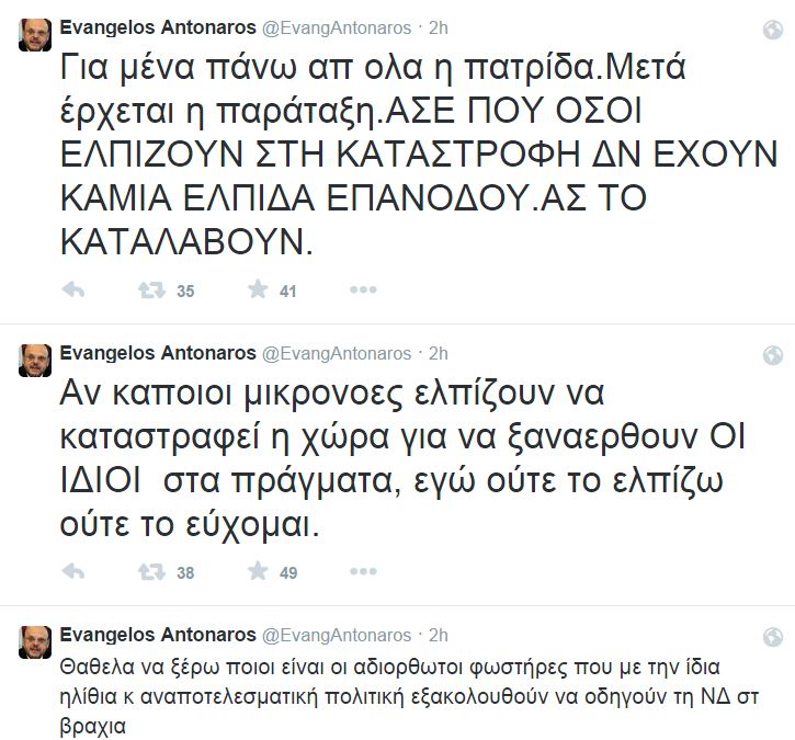 Για μένα πάνω απ όλα η πατρίδα. Μετά έρχεται η παράταξη. ΑΣΕ ΠΟΥ ΟΣΟΙ ΕΛΠΙΖΟΥΝ ΣΤΗ ΚΑΤΑΣΤΡΟΦΗ ΔEΝ ΕΧΟΥΝ ΚΑΜΙΑ ΕΛΠΙΔΑ ΕΠΑΝΟΔΟΥ.ΑΣ ΤΟ ΚΑΤΑΛΑΒΟΥΝ», έγραψε ο κ. Αντώναρος.