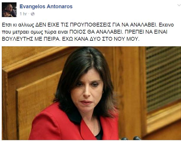 Παράλληλα, ο Ευάγγελος Αντώναρος, μέσω facebook σχολίασε την απόφαση της Άννας Μισέλ Ασημακοπούλου να αρνηθεί την πρόταση του Αντώνη Σαμαρά για τη θέση της νέας γραμματέας της Κοινοβουλευτικής Ομάδας της ΝΔ.