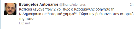 “Κάποιοι λέγανε πριν δύο χρόνια πως ο Καραμανλής οδήγησε τη Νέα Δημοκρατια σε ‘ιστορικό χαμηλό’. Τώρα την βυθίσανε στον ιστορικό της πάτο”, έγραψε ο κυβερνητικός εκπρόσωπος στην κυβέρνηση Καραμανλή, Ευάγγελος Αντώναρος, εννοώντας βεβαίως εμμέσως πλην σαφώς το σημερινό της πρόεδρο Αντώνη Σαμαρά.