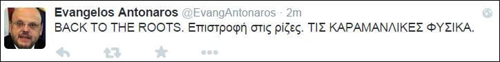 «BACK TO THE ROOTS. Επιστροφή στις ρίζες. ΤΙΣ ΚΑΡΑΜΑΝΛΙΚΕΣ ΦΥΣΙΚΑ», έγραψε ο κ. Αντώναρος, κάνοντας το δικό του σχόλιο μετά την ανακοίνωση των exit polls.