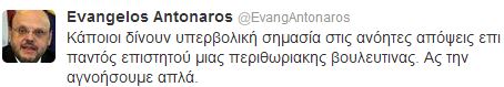 Ο πρώην κυβερνητικός εκπρόσωπος επιτέθηκε μέσω twitter στη βουλευτή της ΔΗΜΑΡ. “Κάποιοι δίνουν υπερβολική σημασία στις ανόητες απόψεις επί παντός επιστητού μιας περιθωριακής βουλευτίνας. Ας την αγνοήσουμε”, έγραψε στη σελίδα του στο twitter του ο Ευάγγελος Αντώναρος.