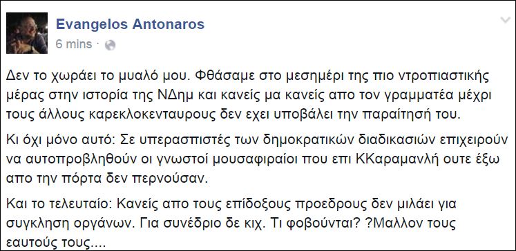 Και το τελευταίο: Κανείς από τους επίδοξους προέδρους δεν μιλάει για σύγκληση οργάνων. Για συνέδριο δε κιχ. Τι φοβούνται? ?Μάλλον τους εαυτούς τους….», έγραψε στον προσωπικό του λογαριασμό στο Facebook ο κ. Αντώναρος.