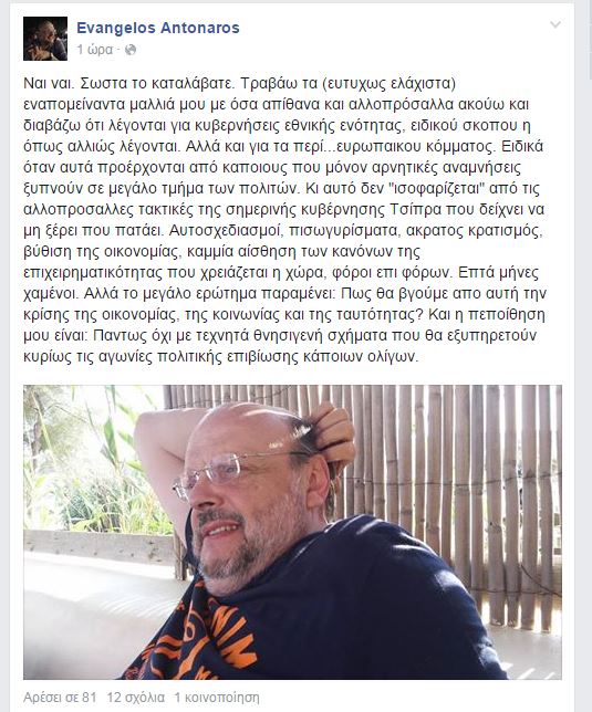 Ο Ευάγγελος Αντώναρος ασκεί έντονη κριτική στην κυβέρνηση Τσίπρα και η ανάρτηση καταλήγει: «Επτά μήνες χαμένοι. Αλλά το μεγάλο ερώτημα παραμένει: Πώς θα βγούμε από αυτή την κρίση της οικονομίας, της κοινωνίας και της ταυτότητας; Και η πεποίθηση μου είναι: Πάντως όχι με τεχνητά θνησιγενή σχήματα που θα εξυπηρετούν κυρίως τις αγωνίες πολιτικής επιβίωσης κάποιων ολίγων».