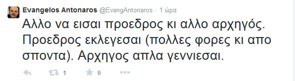 Ένα αιχμηρό σχόλιο ανέβασε στον προσωπικό του λογαριασμό στο Twitter ο πρώην κυβερνητικός Εκπρόσωπος, της κυβέρνησης του Κώστα Καραμανλή, Ευάγγελος Αντώναρος. Συγκεκριμένα, ο κ. Αντώναρος έγραψε: «Άλλο να είσαι πρόεδρος κι άλλο αρχηγός. Πρόεδρος εκλέγεσαι (πολλές φορές κι από σπόντα). Αρχηγός απλά γεννιέσαι».