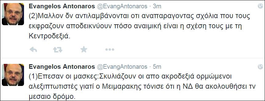 Τη συνέντευξη του προέδρου της Νέας Δημοκρατίας, Ευάγγελου Μεϊμαράκη στην ΕΡΤ, σχολίασε μέσω twitter, ο εκπρόσωπος της κυβέρνησης Καραμανλή, Ευάγγελος Αντώναρος σημειώνοντας χαρακτηριστικά ότι «σκυλιάζουν οι από ακροδεξιά ορμώμενοι αλεξιπτωτιστές γιατί ο Μεϊμαράκης τόνισε ότι η ΝΔ θα ακολουθήσει τον μεσαίο δρόμο».