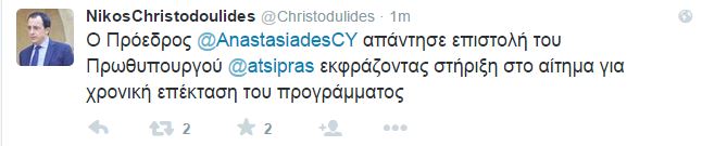 Όπως ανακοίνωσε μέσω twitter ο κυβερνητικός εκπρόσωπος της Κύπρου, Νίκος Χριστοδουλίδης, ο πρόεδρος Αναστασιάδης, απάντησε στην επιστολή του Πρωθυπουργού, Αλέξη Τσίπρα, εκφράζοντας τη στήριξή του στο αίτημα για χρονική επέκταση του προγράμματος.