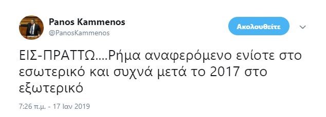«ΕΙΣ-ΠΡΑΤΤΩ….Ρήμα αναφερόμενο ενίοτε στο εσωτερικό και συχνά μετά το 2017 στο εξωτερικό», αναφέρει το tweet που έκανε ο Πάνος Καμμένος.