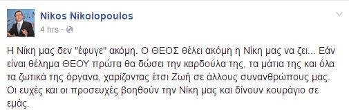 «Η Νίκη μας δεν “έφυγε” ακόμη. Ο Θεός θέλει ακόμη η Νίκη μας να ζει… Εάν είναι θέλημα Θεού πρώτα θα δώσει την καρδούλα της, τα μάτια της και όλα τα ζωτικά της όργανα, χαρίζοντας έτσι ζωή σε άλλους συνανθρώπους μας. Οι ευχές και οι προσευχές βοηθούν την Νίκη μας και δίνουν κουράγιο σε εμάς.» έγραψε ο κ. Νικολόπουλος.