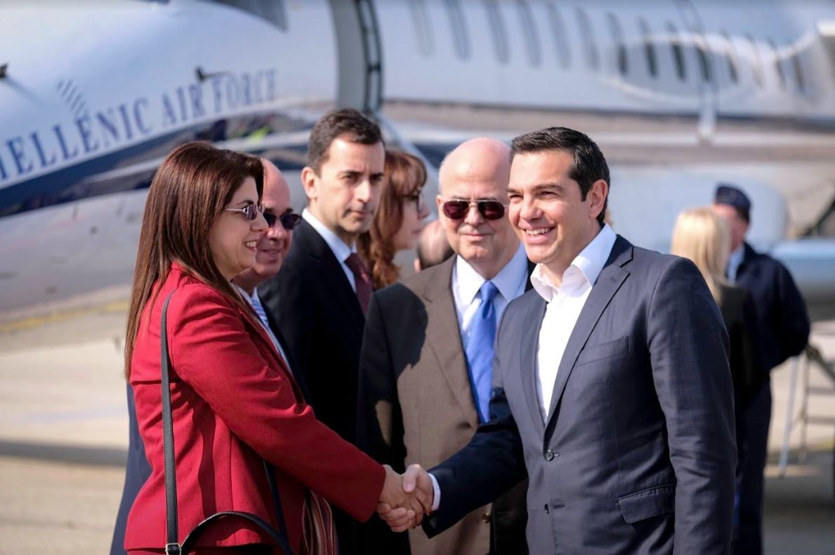 Τον Πρωθυπουργό της Ελλάδας υποδέχτηκαν στο αεροδρόμιο των Σκοπίων η εκ των αντιπροέδρων της κυβέρνησης και υπουργός Άμυνας της Βόρειας Μακεδονίας Ραντμίλα Σεκερίνσκα και ο υπουργός Οικονομίας Κρέσνικ Μπεκτέσι.
