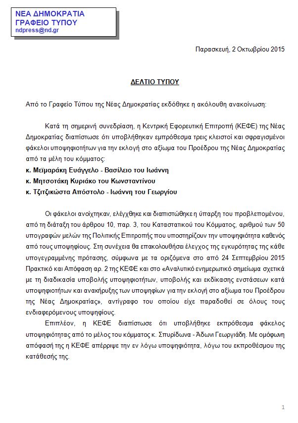 Κατά τη σημερινή συνεδρίαση, η Κεντρική Εφορευτική Επιτροπή (ΚΕΦΕ) της Νέας Δημοκρατίας διαπίστωσε ότι υποβλήθηκαν εμπρόθεσμα τρεις κλειστοί και σφραγισμένοι φάκελοι υποψηφιοτήτων για την εκλογή στο αξίωμα του Προέδρου της Νέας Δημοκρατίας από τα μέλη του κόμματος: