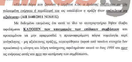 Ο πρώην υπουργός τονίζει ότι δεν είναι καθόλου τυχαία η αναφορά στο έτος 1998, πριν την υπογραφή των συμβάσεων, και αυτό, όπως επισημαίνει, γιατί “σύμφωνα με την πάγια νομολογία για την στοιχειοθέτηση του αδικήματος του άρθρου 35 ΠΚ απαιτείται ‘..τα δώρα ή ανταλλάγματα που δεν αρμόζουν σ’ αυτόν, να δίνονται ή και να υπάρχει υπόσχεση τούτων, για μελλοντική ενέργεια ή παράλειψή του'”.”Εάν τα δώρα που ζητούσε ή λάμβανε κλπ ο δράστης απέβλεπαν σε ήδη τελειωμένη ενέργεια ή παράλειψή του ως υπαλλήλου η πράξη ήταν ανέγκλητη μη αξιόποινη”, προσθέτει.