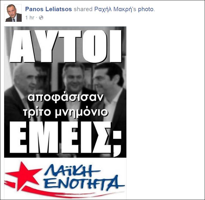 Μάλιστα ανέβασε στον προσωπικό του λογαριασμό στο Facebook μία φωτογραφία της Λαϊκής Ενότητας.