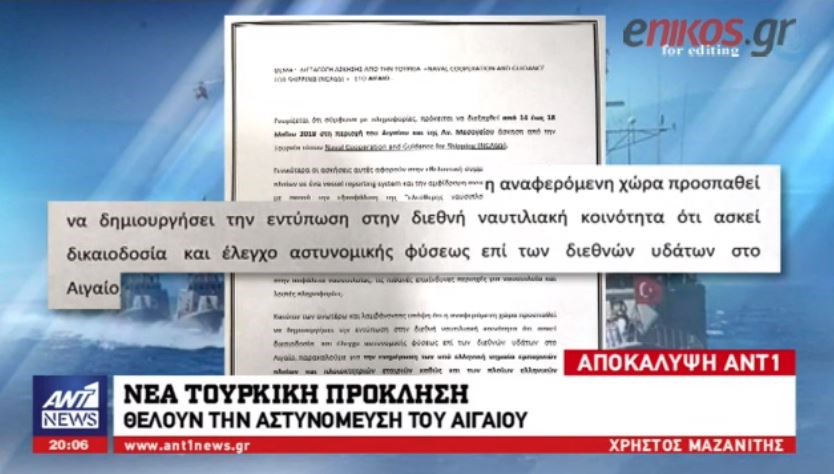 Οι Τούρκοι όπως αποκάλυψε ο Χρήστος Μαζανίτης στο κεντρικό δελτίο ειδήσεων του ΑΝΤ1, με προκάλυψη αυτή την άσκηση, άρχισαν αυτό να το κάνουν σε όλα τα διερχόμενα εμπορικά πλοία στο Αιγαίο. Στόχος; Τι άλλο παρά να δημιουργήσουν την αίσθηση ότι αυτοί αστυνομεύουν το Αιγαίο κι ότι η περιοχή “γκριζάρεται”!
