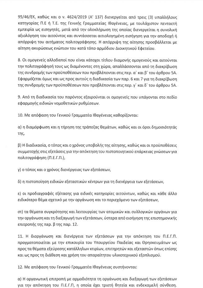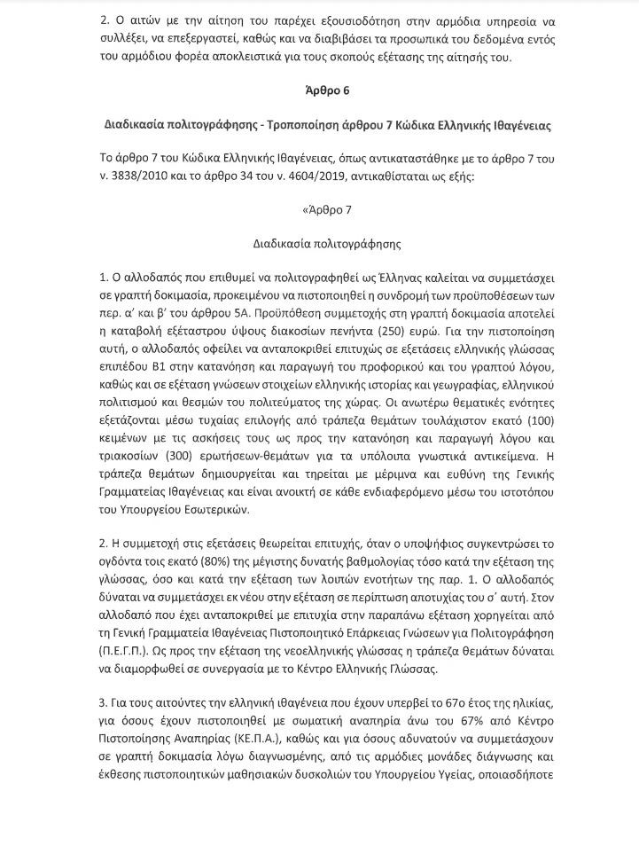 Ο αλλοδαπός που επιθυμεί να πολιτογραφηθεί ως Έλληνας πολίτης καλείται να συμμετάσχει σε γραπτή δοκιμασία, προκειμένου να πιστοποιηθεί η συνδρομή των προϋποθέσεων που υπάρχουν. Για την πιστοποίηση αυτή, οφείλει να ανταποκριθεί επιτυχώς σε εξετάσεις ελληνικής γλώσσας επιπέδου Β1 στην κατανόηση και παραγωγή του προφορικού και του γραπτού λόγου, καθώς και σε εξέταση γνώσεων στοιχείων ελληνικής ιστορίας και γεωγραφίας, ελληνικού πολιτισμού και θεσμών του πολιτεύματος της χώρας. Οι θεματικές ενότητες εξετάζονται μέσω τυχαίας επιλογής από τράπεζα θεμάτων τουλάχιστον 100 κειμένων με τις ασκήσεις τους ως προς την κατανόηση και παραγωγή λόγου και 300 ερωτήσεων -θεμάτων για τα υπόλοιπα γνωστικά αντικείμενα. Η συμμετοχή στις εξετάσεις θεωρείται επιτυχής, όταν ο υποψήφιος συγκεντρώνει το 80% της μέγιστης δυνατής βαθμολογίας τόσο κατά την εξέταση της γλώσσας, όσο και κατά την εξέταση των υπόλοιπων ενοτήτων.