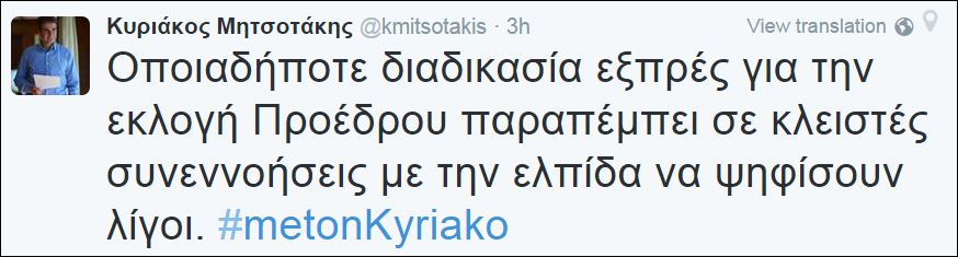 Τη διαφωνία του σε μία διαδικασία – εξπρές για την εκλογή Προέδρου της Νέας Δημοκρατίας διατύπωσε ο Κυριάκος Μητσοτάκης, σημειώνοντας χαρακτηριστικά ότι «παραπέμπει σε κλειστές συνεννοήσεις με την ελπίδα να ψηφίσουν λίγοι»