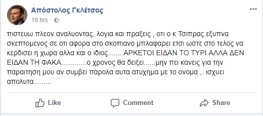 «Πιστεύω πλέον αναλύοντας, λόγια και πράξεις, ότι ο κ. Τσίπρας έξυπνα σκεπτόμενος σε ό, τι αφορά στο σκοπιανό μπλοφάρει έτσι ώστε στο τέλος να κερδίσει η χώρα αλλά και ο ίδιος… ΑΡΚΕΤΟΙ ΕΙΔΑΝ ΤΟ ΤΥΡΙ ΑΛΛΑ ΔΕΝ ΕΙΔΑΝ ΤΗ ΦΑΚΑ… Ο χρόνος θα δείξει… μην πει κανείς για την παραίτηση μου αν συμβεί παρόλα αυτά ατύχημα με το όνομα. Ισχύει απόλυτα».