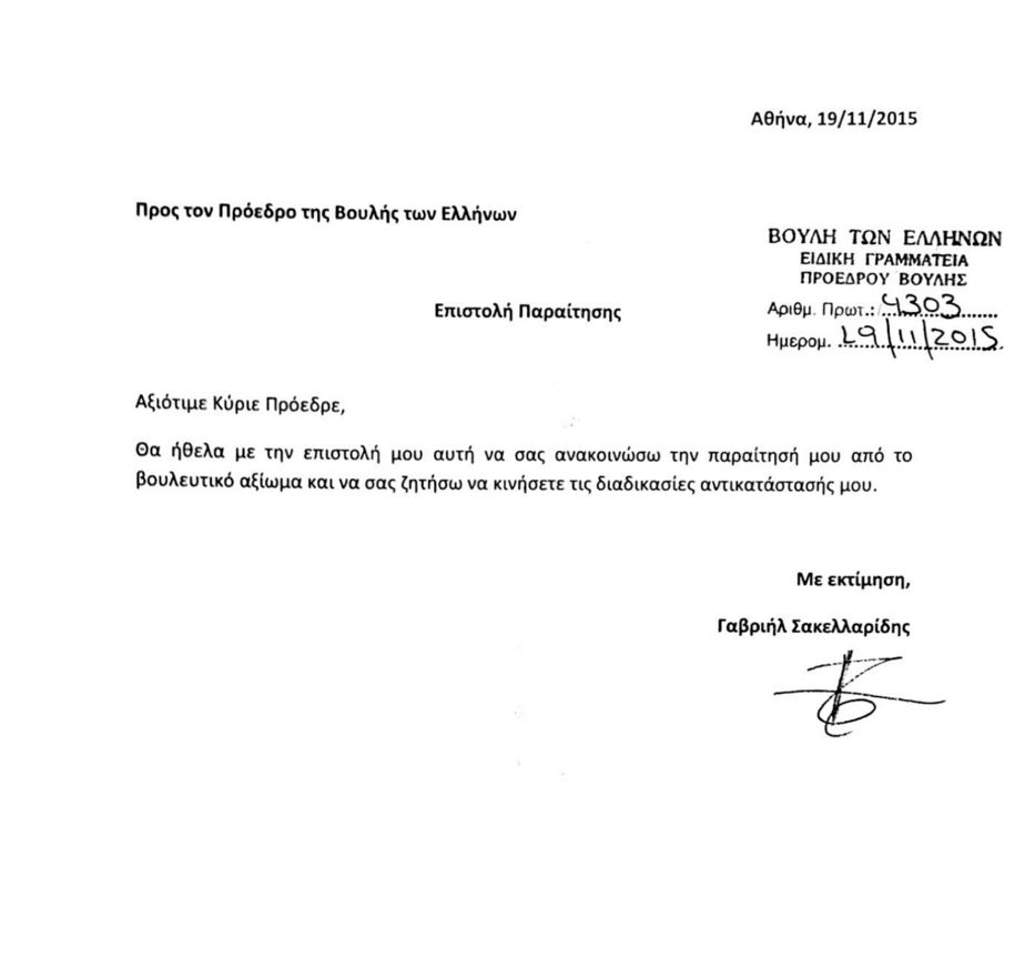 Παραιτήθηκε από το βουλευτικό αξίωμα ο πρώην κυβερνητικός εκπρόσωπος, Γαβριήλ Σακελλαρίδης, έπειτα από αίτημα του Πρωθυπουργού, Αλέξη Τσίπρα. «Αδυνατώ να συμβάλω στην υλοποίηση της κυβερνητικής πολιτικής» αναφέρει στην επιστολή παραίτησής του ο κ. Σακελλαρίδης.