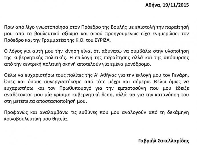“Ο λόγος για αυτή μου την κίνηση είναι ότι αδυνατώ να συμβάλω στην υλοποίηση της κυβερνητικής πολιτικής. Η επιλογή της παραίτησης αλλά και της απόσυρσης από την κεντρική πολιτική σκηνή αποτελούν για εμένα μονόδρομο. Θέλω να ευχαριστήσω τους πολίτες της Α’ Αθήνας για την εκλογή μου τον Γενάρη. Όσες και όσους συνεργαστήκαμε από τότε μέχρι και σήμερα. Θέλω όμως να ευχαριστήσω και τον Πρωθυπουργό για την εμπιστοσύνη που μου έδειξε αναθέτοντας μου μία κρίσιμη κυβερνητική θέση, αλλά και για την κατανόηση του στη μετέπειτα αποστασιοποίησή μου.