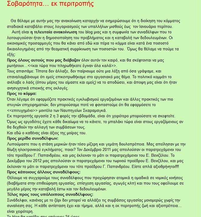 Αυτή είναι η τελευταία ανακοίνωση του blog μιας και η συμφωνία των συναδέλφων που το λειτουργούσαν ήταν η δημοσιοποίηση του προβλήματος και η καταβολή των δεδουλευμένων. Οι οικονομικές προσαρμογές που θα κάνει από εδώ και πέρα το κόμμα είναι κατά ένα ποσοστό δικαιολογημένες από την θεαματική συρρίκνωση των ποσοστών του. Όμως θα θέλαμε να πούμε τα εξής:
