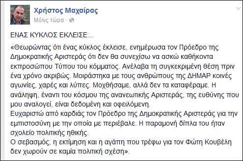 Την αποχώρησή του από την θέση του εκπροσώπου Τύπου της Δημοκρατικής Αριστεράς ανακοίνωσε ο Χρήστος Μαχαίρας με ανάρτησή του στο Facebook.