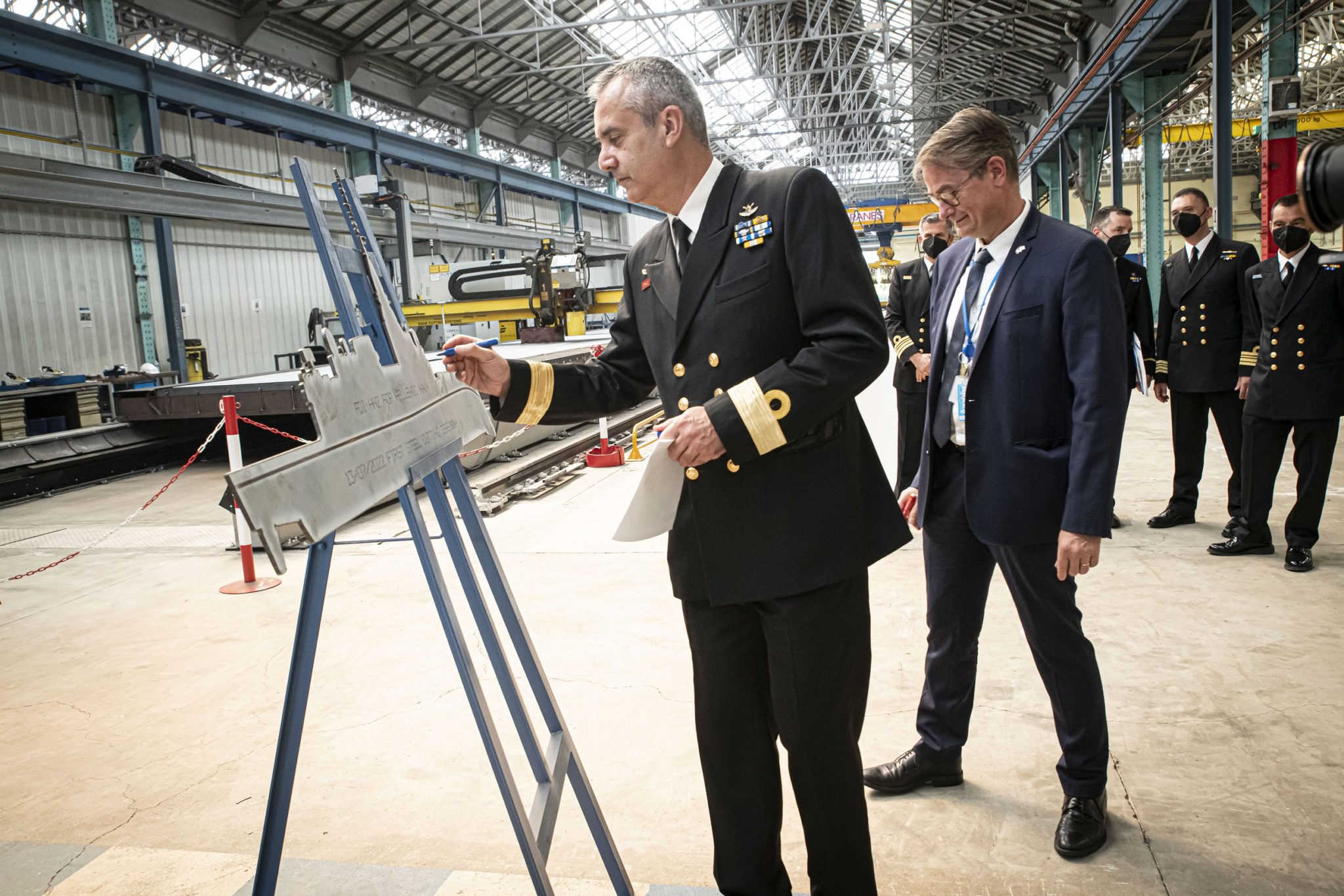 H τελετή πραγματοποιήθηκε με την παρουσία του Διευθυντή Προγράμματος για τις Φρεγάτες του Ελληνικού Πολεμικού Ναυτικού, της Naval Group, Gilles Langlois, όπως και του Αρχιπλοιάρχου κ. Θεοχάρη Χατζόπουλου (ΠΝ), Διοικητή του Κλιμακίου του Ελληνικού Πολεμικού Ναυτικού στο Lorient.