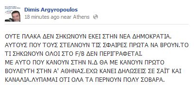 Με νέα ανάρτηση στο Facebook, απάντησε στην ανακοίνωση της Νέας Δημοκρατίας ο υποψήφιος και στέλεχος των Ανεξάρτητων Ελλήνων, Ντίμης Αργυρόπουλος, όπως προανήγγειλε μέσω του enikos.gr.