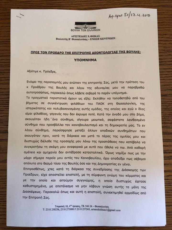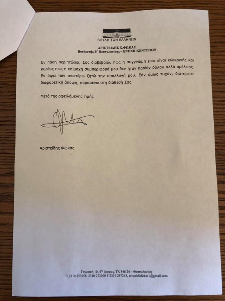 Μεταξύ άλλων στην επιστολή του ο κ. Φωκάς σημειώνει πως «από καθαρή αμέλεια και αμηχανία δεν αντέδρασα κατασταλτικά. Όμως νομίζω πως με την μέχρι σήμερα πορεία μου εντός του Κοινοβουλίου, έχω αποδείξει πως σέβομαι απόλυτα στο θεσμό τόσο της Βουλής όσο και της Δημοκρατίας εν γένει».