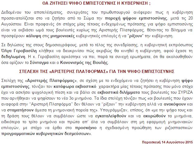 Στελέχη της «Αριστερής Πλατφόρμας», σε σχέση με το ενδεχόμενο να ζητήσει η κυβέρνηση ψήφο εμπιστοσύνης, τόνιζαν τον κατάφωρα εκβιαστικό χαρακτήρα μίας τέτοιας πρότασης που μόνο στόχο έχει να ασκήσει ψυχολογική πίεση και να βάλει σε εκβιαστικά διλήμματα τους βουλευτές του ΣΥΡΙΖΑ που αρνήθηκαν να ψηφίσουν το νέο 3ο μνημόνιο. Τα ίδια στελέχη τόνιζαν πως «οι βουλευτές που έχουν αναφορά στην ‘‘Αριστερή Πλατφόρμα’’ δεν θέλουν να ‘‘ρίξουν’’ την κυβέρνηση, αλλά να ανακόψουν και να σταματήσουν άμεσα τη μνημονιακή πορεία της».