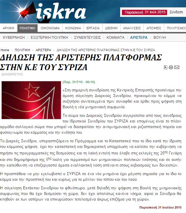 «Στη σημερινή συνεδρίαση της Κεντρικής Επιτροπής προτείναμε την άμεση σύγκληση Διαρκούς Συνεδρίου, προκειμένου το κόμμα να συζητήσει συντεταγμένα πριν συναφθεί και έρθει προς ψήφιση στη Βουλή η νέα μνημονιακή συμφωνία.