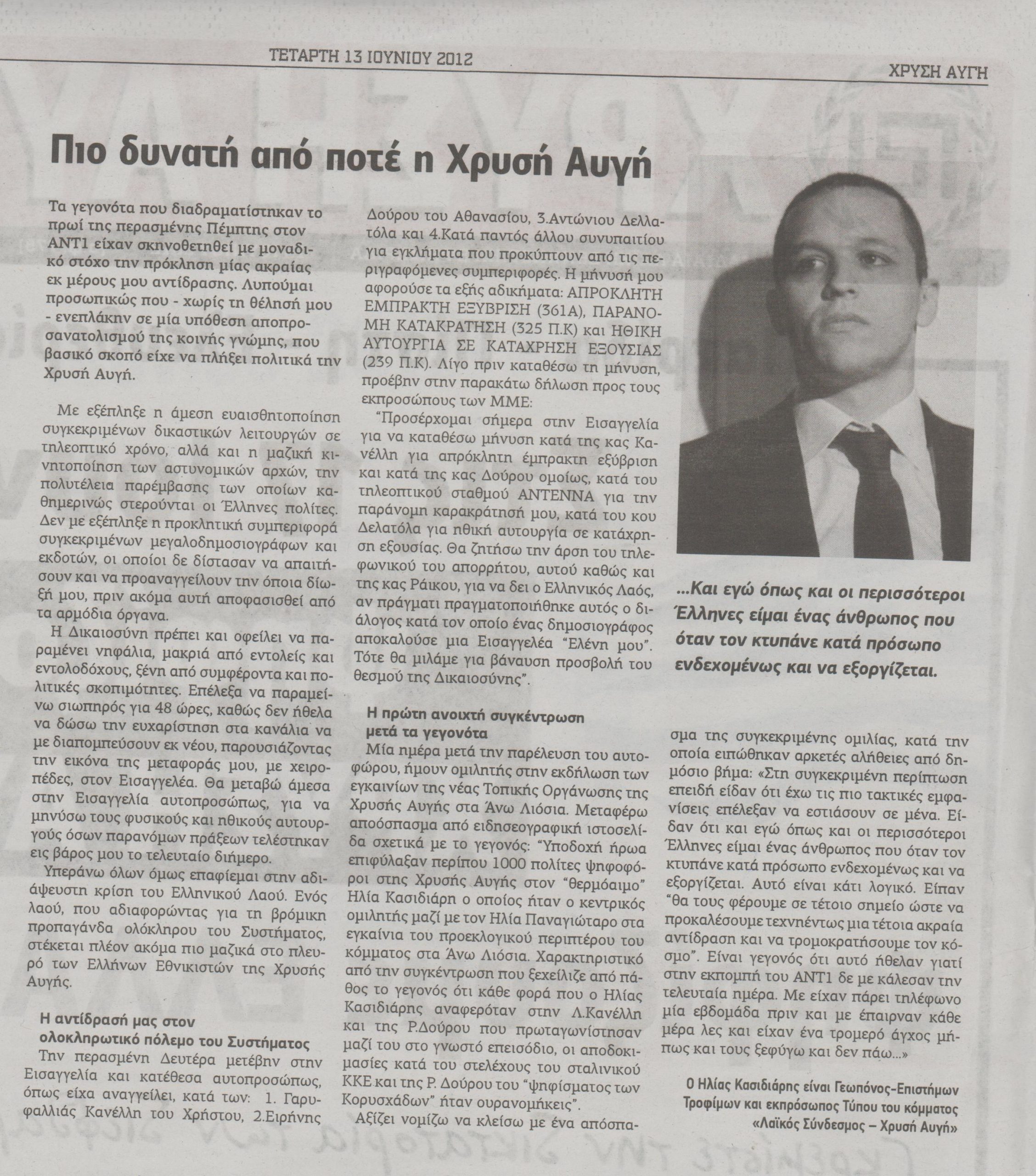 Στο περιστατικό της επίθεσής κατά της Λιάνας Κανέλλη και της Ρένας Δούρου, αναφέρεται ο Ηλίας Κασιδιάρης, σε άρθρο του στην εφημερίδα της Χρυσής Αυγής με τίτλο «Πιο δυνατή από ποτέ Χρυσή Αυγή».Για μία ακόμη φορά ο Ηλίας Κασιδιάρης τονίζει ότι τα γεγονότα στο στούντιο του ΑΝΤ1 ήταν σκηνοθετημένα : «Τα γεγονότα που διαδραματίστηκαν το πρωί της περασμένης Πέμπτης στον ΑΝΤ1 είχαν σκηνοθετηθεί με μοναδικό στόχο την πρόκληση μίας ακραίας εκ μέρους μου αντίδραση».«Λυπούμαι προσωπικώς που-χωρίς τη θέλησή μου-ενεπλάκην σε μία υπόθεση αποπροσανατολισμού της κοινής γνώμης, που βασικό σκοπό είχε να πλήξει πολιτικά την Χρυσή Αυγή», σημειώνει ο εκπρόσωπος του κόμματος.Αναφέρει επίσης ότι τον εξέπληξε η άμεση ευαισθητοποίηση συγκεκριμένων δικαστικών λειτουργών σε τηλεοπτικό χρόνο, αλλά και η μαζική κινητοποίηση των αστυνομικών αρχών, την πολυτέλεια παρέμβασης των οποίων καθημερινώς στερούνται οι Έλληνες πολίτες.«Δεν με εξέπληξε», συμπληρώνει, «η προκλητική συμπεριφορά συγκεκριμένων μεγαλοδημοσιογράφων και εκδοτών, οι οποίοι δεν δίστασαν να απαιτήσουν και να προαναγγείλουν την όποια διώξή μου, πριν ακόμα αυτή αποφασισθεί από τα αρμόδια όργανα».Ο Ηλίας Κασιδιάρης επισημαίνει ότι «η δικαιοσύνη πρέπει να και οφείλει να παραμείνει νηφάλια, μακριά από εντολείς και εντολοδόχους, ξένη από συμφέροντα και πολιτικές σκοπιμότητες.» Εξηγεί μάλιστα γιατί είχε εξαφανιστεί για δύο ημέρες: «Επέλεξα να παραμείνω σιωπηρός για 48 ώρες, καθώς δεν ήθελα να δώσω την ευχαρίστηση στα κανάλια να με διαπομπεύουν εκ νέου, παρουσιάζοντας την εικόνα της μεταφοράς μου, με χειροπέδες, στον εισαγγελέα».«Επαφίεμαι στην αδιάψευστη κρίση του ελληνικού λαού», προσθέτει ο Ηλίας Κασιδιάρης . Ο υποψήφιος βουλευτής κλείνει το άρθρο του με ένα απόσπασμα της ομιλίας του στα Άνω Λιόσια: «Είδαν ότι και εγώ όπως και οι περισσότεροι Έλληνες είμαι ένας άνθρωπος που όταν τον κτυπάνε κατά πρόσωπο ενδεχομένως και να εξοργίζεται»… ΔΕΙΤΕ ΤΟ ΑΡΘΡΟ ΤΟΥ ΗΛΙΑ ΚΑΣΙΔΙΑΡΗ