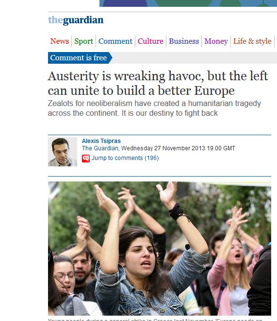 «Οι ευρωπαίοι ηγέτες που ισχυρίζονται ότι το φάρμακο της λιτότητας είναι επιτυχία (success) είναι υποκριτές καθώς για εκατομμύρια ανθρώπους το ευρωπαϊκό όνειρο έχει μετατραπεί σε εφιάλτη», αναφέρει ο πρόεδρος του ΣΥΡΙΖΑ και ορίζει τις ευρωεκλογές του Μαΐου ως «μια ευκαιρία να ξεκινήσει ένας διάλογος μεταξύ των λαών με στόχο τη συγκρότηση μιας νέας βάσης για την ουσιαστική δημοκρατία και την ανθρώπινη αξιοπρέπεια».