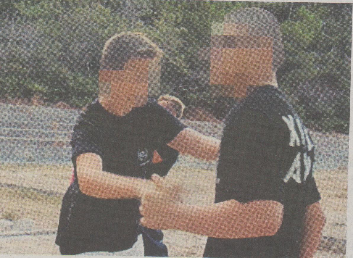 Στις φωτογραφίες που δημοσιεύει σήμερα το Έθνος φαίνεται ο αστυνομικός να παραδίδει μαθήματα… αυτοάμυνας σε μέλη του κόμματος, ενώ ανάμεσά τους βρίσκονται και ανήλικα παιδιά.