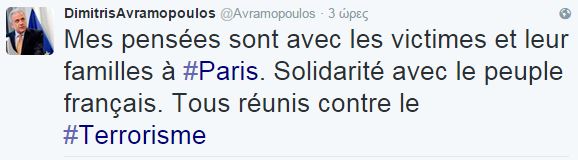 «Οι σκέψεις μου είναι με τα θύματα και τις οικογένειές τους στο #Paris. Αλληλεγγύη με τους Γάλλους. Όλοι μαζί κατά την #Terrorisme