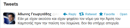 Μετά την άκαρπη συνάντηση της υπουργού Ανάπτυξης, Άννας Διμαντοπούλου με τους εκπροσώπους της ΠΝΟ για την επερχόμενη απεργία της Ομοσπονδίας, ο Άδωνις Γεωργιάδης έσπευσε να σχολιάσει μέσα από το twitter: