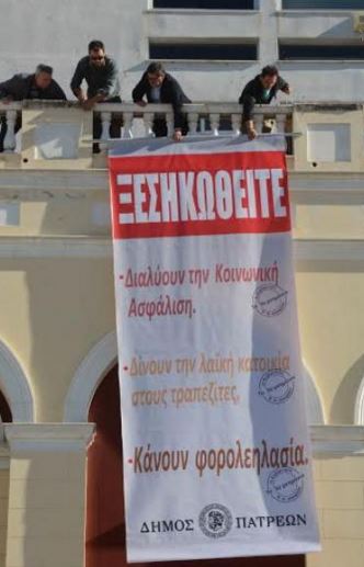 Ένα μεγάλο πανό με σύνθημα «Ξεσηκωθείτε», κάλυψε το πρωί την πρόσοψη του Μεγάρου Λόγου και Τέχνης, στην Πάτρα. Το πανό ωστόσο δεν το ανήρτησαν μόνοι τους οι δημοτικοί υπάλληλοι αλλά μαζί με τον ίδιο τον Δήμαρχο Πατρέων Κώστα Πελετίδη, ο οποίος συμμετείχε και στη συμβολική κατάληψη του Δημαρχείου.