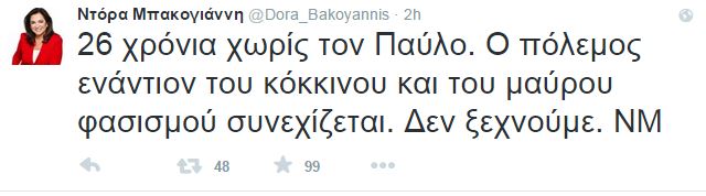 “26 χρόνια χωρίς τον Παύλο. Ο πόλεμος ενάντιον του κόκκινου και του μαύρου φασισμού συνεχίζεται. Δεν ξεχνούμε. ΝΜ” έγραψε.