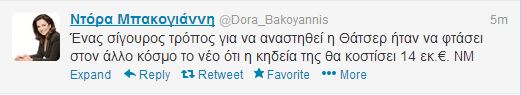 “Ένας σίγουρος τρόπος για να αναστηθεί η Θάτσερ ήταν να φτάσει στον άλλο κόσμο το νέο ότι η κηδεία της θα κοστίσει 14 εκ. €” γράφει η Ντόρα Μπακογιάννη στο twitter.