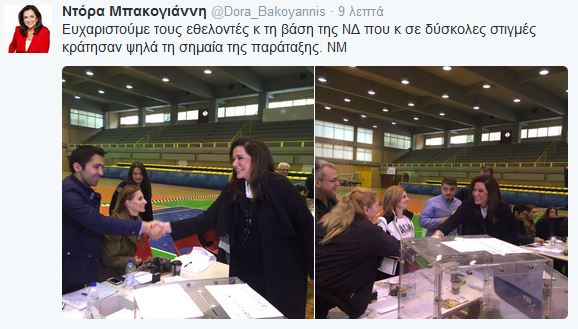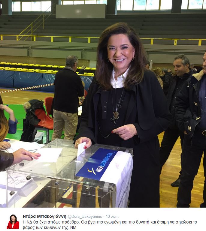 Η κα.Μπακογιάννη, ανέβασε φωτογραφίες μετά την άσκηση του εκλογικού της δικαιώματος και ανέφερε στο Twitter: «Η ΝΔ θα έχει απόψε πρόεδρο. Θα βγει πιο ενωμένη και πιο δυνατή και έτοιμη να σηκώσει το βάρος των ευθυνών της»