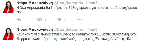 Η Ντόρα Μπακογιάννη με μήνυμα της στο Twitter, αφού πρώτα εξέφρασε τα συλλυπητήριά της για τους χειριστές του μοιραίου ελικοπτέρου, ανέφερε ότι η Νέα Δημοκρατία θα ζητήσει σε βάθος έρευνα για τα αίτια του δυστυχήματος.
