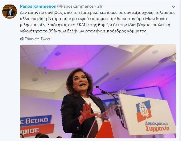 Στα όσα είπε η κυρία Μπακογιάννη απάντησε ο υπουργός Εθνικής Άμυνας Πάνος Καμμένος μέσω twitter, χαρακτηρίζοντάς τη συνταξιούχο πολιτικό. Μάλιστα επισημαίνει στην ανάρτησή του ότι “την ίδια βάφτισε πολιτική γελοιότητα το 99% των Ελλήνων όταν έγινε πρόεδρος κόμματος”.