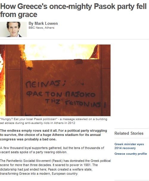 Φιλοξενώντας ένα σύνθημα σε τοίχο της Αθήνας που αναφέρει χαρακτηριστικά «Πεινάς; Φάε τον Πασόκο της γειτονιάς!», το BBC «σκιαγραφεί» το προφίλ του ΠΑΣΟΚ.