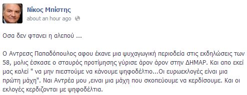 «Όσα δεν φτάνει η αλεπού … Ο Ανδρέας Παπαδόπουλος αφού έκανε μια ψυχαγωγική περιοδεία στις εκδηλώσεις των 58, μόλις έσκασε ο σταυρός προτίμησης γύρισε άρον άρον στην ΔΗΜΑΡ. Και από εκεί μας καλεί ” να μην πιεστούμε να κάνουμε ψηφοδέλτιο… Οι ευρωεκλογές είναι μια πρώτη μάχη”. Ναι Ανδρέα μου, είναι μια μάχη που σκοπεύουμε να κερδίσουμε. Και οι εκλογές κερδίζονται με ψηφοδέλτια», έγραψε ο Νίκος Μπίστης.